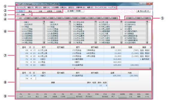 上段には前入力済仕訳データがあり、各項目ごとの内容が同じであれば、TabキーかEnterキーを押下すると同内容が入力されます。